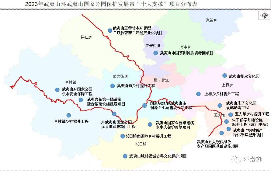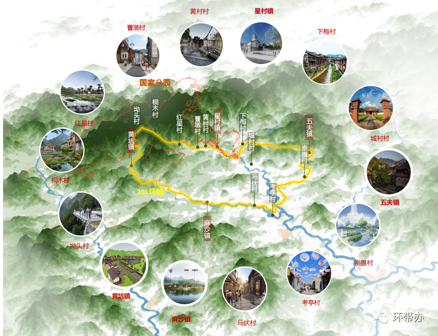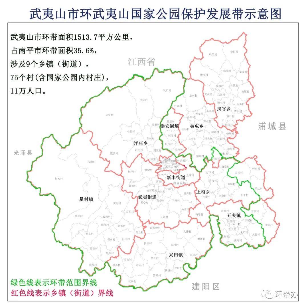 环武夷山国家公园保护发展带是在武夷山国家公园福建范围(1001平方公里)外,南平市初步划定了4252平方公里“缓冲区”。其中,涉及武夷山市环带面积1513.712平方公里(占南平市环带面积35.6%),9个乡镇(街道)(不含岚谷乡),75个村(含国家公园范围内2个村),约11万人口。